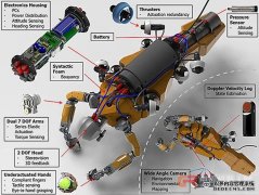 从上图可以看到,可抓取物体的手部(上面有许多摄像头,可以用来看清水下物体)以外,OceanOne还配备了各种传感器,包括压力传感器,扭力传感器,航向传感器等等;全视角摄像头可以用来导航,探测环境地图,而且它还配备了个黑匣子,叫多普勒计程仪,除了检测航程外,还可以预测当下状态。