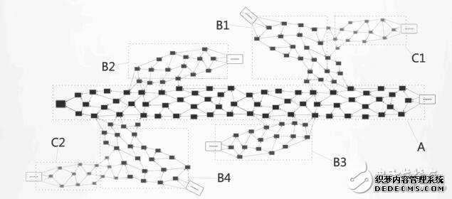 当网络中的节点的数量和交易者的数量足够多时,TOS网络的区块就形成了多个不同层级的区块网络,如下图所示,区块网络形成的越早,区块网络的层级越高; A区块网络中的区块为最早形成的区块网络是层级最高的区块网络, B1-B4为A区块网络的子区块网络,A区块网络为B1-B4区块网络的父区块网络,C1-C2区块网络处于当前区块网络的末层,为当前层区块网络的最低层;层级较高的区块网络在交易中逐渐衍生出多个层级较低的区块网络分层,以此类推,最终形成了类似于海洋、江河、小溪的区块网络结构。
