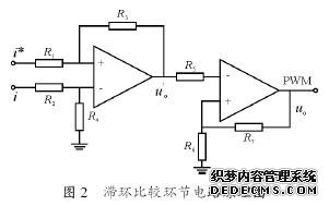 高功率因数整流器的核心部分为开关管VT的控制电路部分,本方案控制部分电路结构简单易懂,主要包括PI 调节器环节、乘法器环节、电压电流检测环节、开关管驱动环节以及滞环比较环节。而其中的关键是滞环比较环节的设计,滞环比较环节电路原理图如图2所示。