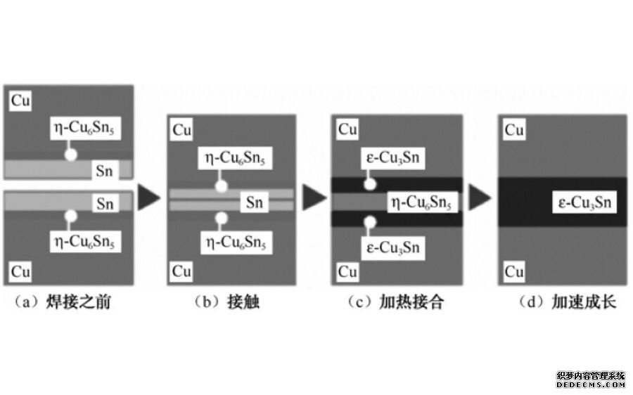 ●平直界面的致密层:当Pb含量、温度和反应时间增加时,η层的形貌逐渐从粗糙的胞状层向扇贝状的致密层转变。ε层总是致密的且界面接近平直。快的冷却速率产生平直的Cu6Sn5层,慢的冷却速率出现小瘤状的Cu6Sn5形貌。再流时间对IMC形貌也有影响,时间短产生平直的η相形貌,时间长则更多产生小瘤状的或扇贝状的η相。而ε层与再流时间无关,它总是平直地生长。因此,当将两种接触的母材金属加热使Sn熔融时,由于温度的作用,在两母材金属表面将发生明显的冶金反应而使两母材金属连接起来。此时在两母材表面之间的接缝中将同时存在ε-Cu3Sn和η-Cu6Sn5两种金属间化合物层。贴近Cu表面生成的是ε-Cu3Sn,而原来中间的纯Sn层为生成的η-Cu6Sn5相所取代,此时的界面构造如图2(c)所示。4.加速生长在等温凝固的最初阶段,Cu6Sn5和Cu3Sn相的生长,是以Cu6Sn5的生长为主。当所有可反应的Sn都消耗完后,Cu3Sn相的生长通过消耗掉Cu和Cu6Sn5进行反应,最后,接合层就仅由Cu3Sn构成了。按连接的可靠性来说,图2(c)所示的状态是比较理想的。若此时对接合部继续加热,ε-Cu3Sn快速发育,其结果是整个接缝均被ε-Cu3Sn填充。由于ε-Cu3Sn金属间化合物是一种硬度更高而脆性更大的合金相,如果温度过高,生成的金属间化合物太厚,焊点的机械强度就会降低。