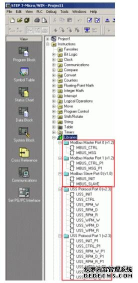 在STEP7Micro/WIN中,ModbusRTU协议和USS协议操作库位于操作树的库文件夹中。MODBUS函数库要求STEP7Micro/WIN为V3.2或更高版本。