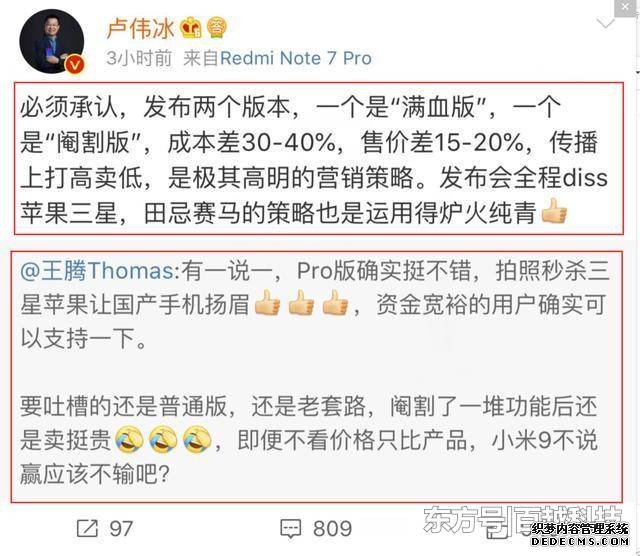 小米副总裁、Redmi总经理卢伟冰也表示:“必须承认,发布两个版本,一个是“满血版”,一个是“阉割版”,成本差30-40%,售价差15-20%,传播上打高卖低,是极其高明的营销策略。发布会全程diss苹果三星,田忌赛马的策略也是运用得炉火纯青。”
