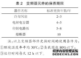 为了使变频器长期正常工作,必须针对变频器内部电子元器件的使用寿命,定期进行保养和维护。变频器电子元器件的使用寿命又因其使用环境和使用条件的不同而不同。表2所列变频器的保养期限仅供用户使用时参考。