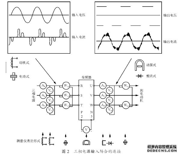 变频器的电源侧、输出侧的电压、电流因为含有高频成分,所以测量仪表和测量回路不同,所得到的数据也是不同的。用工频仪表测量时,三相电源输入场合的连接如图2 所示,单相电源输入场合的连接如图3 所示。