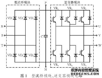 检查前,拆下逆变模块、整流模块与外部连接的电源线(R、S、T)和与电动机连接的接线(U、V、W)端子,将万用表拨到R伊100赘挡。分别测量R、S、T、U、V、W、P 和N 处,变换万用表表笔,测量其导通状态,便可判断它们是否性能良好。整流桥模块、逆变器模块电路如图1所示,测试结果见表1。