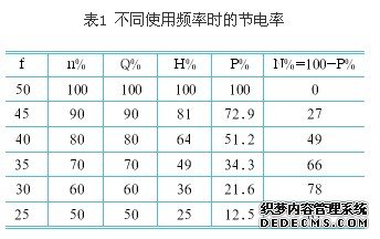异步电动机半导体制造厂务系统最主要的动力设备。作为高能耗设备,其输出功率不能随负荷按比例变化,大部分只能通过挡板或阀门的开度来调节,而电动机消耗的能量变化不大,从而造成很大的能量损耗。使用变频器对电动机电源进行企业节能降耗、提高效率的重要手段。一般使用的风机、水泵类它们额定风量、水量都超过实际需要,又因工艺的需要,往往运行中要改变风量、水量,而目前多数采用档板或阀门来调节的,虽然方法简单,但实质是人为增加阻力的办法。因此浪费大量电能,属不经济的调节方式。从流体力学原理可知,风机的风量、水泵的流量与电机转速及电机功率的关系如下:当风机转速下降时,电动机的功率迅速降低,例风量下降到80%,转速亦下降到80%时,则轴功率下降到额定的51%,若风量下降到50%,轴功率将下降到额定的13%,其节电潜力非常大,并有下述曲线、阴影部分表示采用变频器调速方式的节电效果,其节电可达30-40%效果十分明显。对不同使用频率时的节电率n%可查表1。