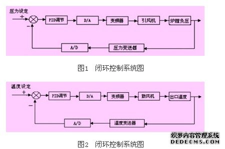 原引风机运行方式是降压启动、工频运行,其风量大小采用调节风门的方法来调节风量。这种控制方式的缺点是电能浪费大,调节实时性差,噪声大,工人的劳动强度大。故对其进行变频改造,引风机闭环控制原理如框图1所示,采用微差变送器、变频器、控制器、引风机组成的压力闭环回路自动控制引风机的转速,使炉膛保持一稳定的微负压,这样既提高了控制精度,又节约了能源,使引风机控制具有一定的合理性。