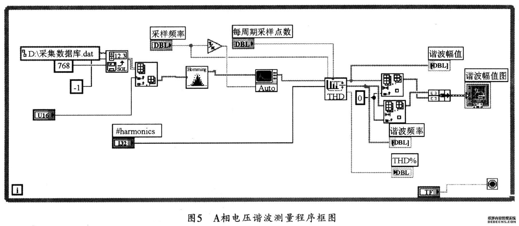 需要对采集到的数据进行谐波分析时,可利用索引数组Index Array从数据文件采集数据库,dat中分别取出每一行的数据,并依次加载在功能函数Hamming Window.vi的input signal引脚上,再通过#harmonics设置谐波次数(谐波次数可设置为40次1,这样,各次谐波的幅值和频率将以数组形式表示出来。由于谐波的幅值和频率包含基频成分,故可通过Delete From Array.vi除去其中的基波信号,然后再通过谐波幅值图形象显示除基波外各次谐波的幅值。图5为A相电压谐波测量的流程框图。