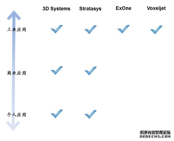 现有市场上主要公司有美国的3DSystems,Stratasys和Exone,以及瑞典的ArcamAB。市场未来发展的主要驱动点为:利用3D打印技术降低结构复杂部件的生产及设计难度和提高快速生产定制产品的能力。我们将近期与3D打印技术相关联的大公司罗列如下:
