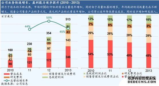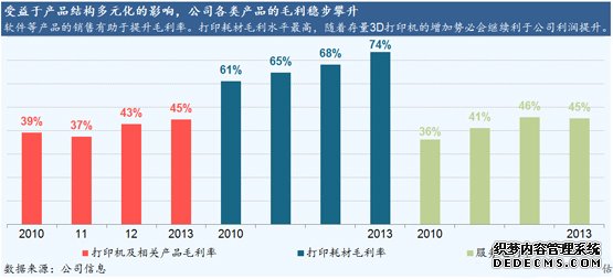 可以期待的是在3D打印机保有量和使用率都在不断上升的情况下,公司高毛利的打印耗材类产品的销量也会随之不断增加。我们基于三点认为第三方耗材不会影响到公司耗材的销售。首先,市场现在的第三方打印耗材还非常的少,而且基本用于民用级产品上,公司自有专业耗材仍在不断更新中,第三方有很长的路才能赶上;第二,使用第三方耗材会有丧失产品售后保障的危险;第三,公司主要客户为工业和商业级用户,此类用户大多对耗材价格不敏感,而且多会使用原厂耗材。