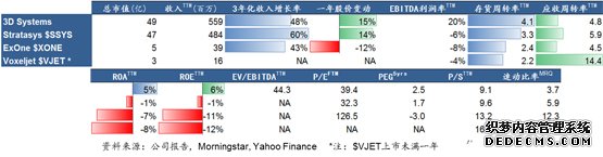估值水平:所有可比公司的估值在2013年至今都经历了较大幅度的波动,由于Stratasys、ExOne和Voxeljet在盈利上的波动导致多个估值指标都无法比较,通过唯一可比的P/S指标可以看出,市场给予3DSystems和Stratasys相似的估值水平,同时市场对于像ExOne和Voxeljet这样经营纯粹的工业级应用的公司给予了较高的溢价。