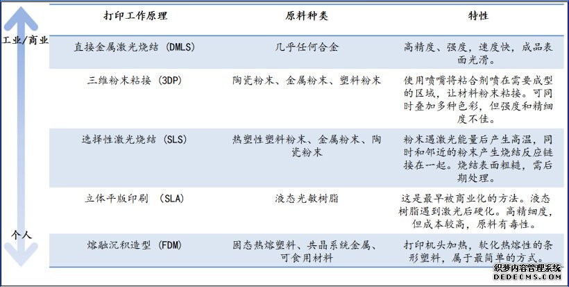 3D打印简单说就是将普通二维(x-y)打印增加一个高度的维度(-z)。想象一下,任何一个立体的部件都可以在高度的维度上被切成许多层的二维平面,3D打印机就在二维平面上将塑料或者金属等材料一层层的打印出来并叠加在一起。为便于读者理解,我们将主要的3D打印技术归纳如下: