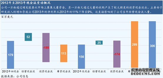 经营能力:公司的存货周转率及应收账款周转率均优于可比公司。存货周转率指标用于衡量公司库存的流动性及管理效率,远高于可比公司的比率说明公司将产品销售及变现的能力强劲。深入分析其资产负债表后可以发现,公司并未故意压低库存总量,为应对销售的增长,公司净库存量占收入比例反而从11年的11%增加至13年的15%。较高的应收账款周转率意味着公司相对客户强势,其产品销售后的收款速度快,坏账损失相应就少,资产流动性高,偿债能力强。但公司的应收账款周转率近三年来呈现下降趋势,该比例从11年的5.0下降到了13年的4.1,投资者需要继续观察该指标是否会有继续下降的压力。