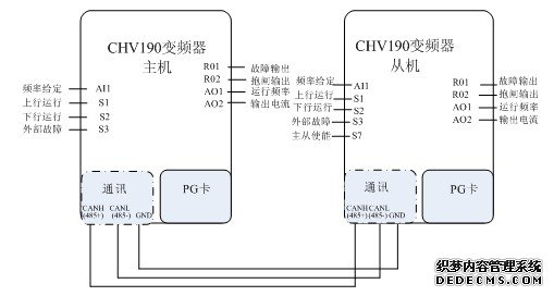 主从控制是一种分配两电机或多个电机间的负荷使其达到均匀平衡的控制方式,当一个传动设备是由两个或多个电机驱动的时候,同时两个电机或多个电机轴通过齿轮、链条或传送带等相互耦合在一起,就需要通过主从控制来分配各个电机间的负荷,以满足控制精度。外部控制信号可以只与主机连接,主机通过一个串行通讯链路(CAN总线或者485总线)来控制从机。也可以主机和从机都连,通讯只传递主机转矩信号。