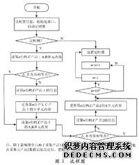 通过定时函数和循环控制函数,周期地依次向各个PLC发送读写PLC的FINs命令码,再在OnComm函数中加入对不同PLC响应码的处理函数,就可实时地完成对PLC数据的采集。同时根据响应码的内容监视PLC的运行状态。PLC自动将检验的产品性能数据连续存入D存储区中,当存储区满时自动从头循环覆盖存放,上位机定时将PLC的D存储区的产品数据读入、处理并存人数据库。该系统中上位机1 min内可依次读完10台PLC的各自1条产品性能信息,而PLC检验完1个产品需15 min左右,故可满足相对的实时性。为保证上位机完整且不重复地读取PLC的所有产品性能数据,在各台PLC中对每种产品都定义了A,B两个存储单元,A单元存放上位机读取过的最后一条信息地址,当上位机每读完1条信息,就由上位机对此单元的内容更新;B单元存放最新的产品信息存放地址,当PLC每产生1条新信息时,就由PLC更改该单元内容;上位机在读取产品信息前,先对比A,B单元的内容,决定是否进行数据读取和读取哪个地址的数据。这样即使上位机与PLC断开一定时间后,当重新连接上,也可将以前没读到的信息读入。程序流程图如图3所示。