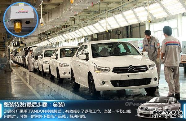 总装分厂是新车生产最后经历的地方,其将车门、车灯和内饰等部件通过流水线进行安装。总装分厂应用了车身跟踪系统,并通过电子标签实现在任何环节的实时监控,保证全新爱丽舍的优秀品质。并且其采用了ANDON停线模式,当某一环节出现问题时可第一时间停下整条产品线,减少返修工位,提高生产效率。