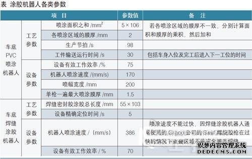 式中L焊缝密封胶涂胶总长度(mm);t2设备精确定位时间s(焊缝涂胶jrs英超直播吧_jrs直播_极速体育nba直播吧需要对车底焊缝进行精确定位)。以我公司某车间改造项目为例,计算jrs英超直播吧_jrs直播_极速体育nba直播吧所需的数量如表所示。