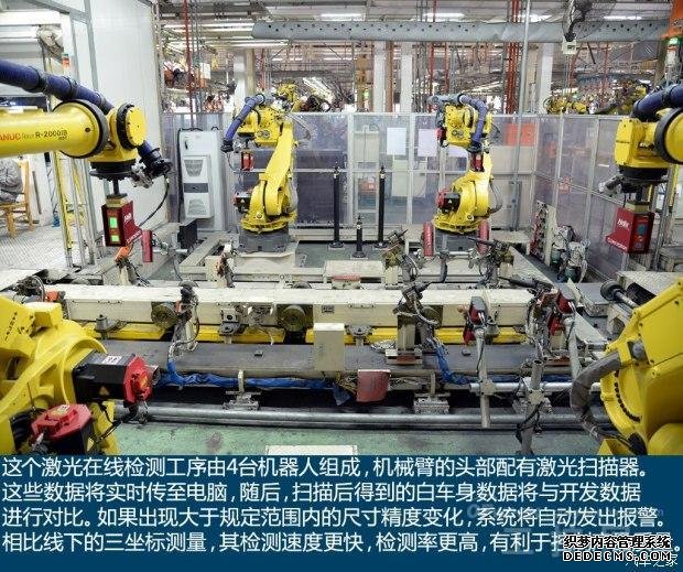 由于襄阳工厂建成时间较早,因此在设备自动化率上并未像宝马铁西工厂那样,拥有超过90%以上的自动化率。在地板总成中仍旧主要依靠人工焊接,不过在侧围总成的焊接中,可以看到jrs英超直播吧_jrs直播_极速体育nba直播吧开始取代人工。此后,操作员将地板总成、侧围总成、四门两盖组合后,我们熟悉的车身造型初露真容。为了保证产品质量,在焊装车间的检验工序,激光在线测量、三坐标测量、超声波检测等一应俱全,这样的严谨也为下期将要见到的涂装开了个好头。