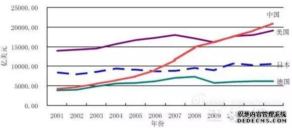 2001-2012年四国制造业工业增加值变化曲线