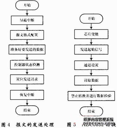 输出和之前相反的数据,也是8位,只是这个时候是低位在前;最后便是拉高CS,禁止使能A/D转换,对该2个8位数据进行比对,将转换结果送到数据寄存器中。图5是ADC转换的流程图。