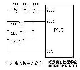 (5) 出入触点的合并,将某些功能相同的开关量输入设备合并输入(常闭触点串联输入、常开触点并联输入)。一些保护电脑的报警电路常常采用该方法。