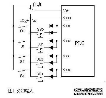 (2)分组输入,如下图,系统有手动和自动两种工作方式。用X0来识别使用自动还是手动操作信号,手动时输入信号为SB0~SB3,如果按正常的设计思路,那么需要X0~X7一共8个输入点,若按下图的方法实际,则只需要X1~X4一共4个输入点。图中的二极管用来切断寄生电路。如果图中没有二极管,系统处于自动状态,SB0、SB1、S0闭合S1断开,这时电流从com端子流出,经SB0、SB1、S0形成寄生贿赂流入X0端子,使输入位X2错误的变为on。各开关串联了二极管后,切断了寄生回路,避免了错误的产生。但是用应考虑输入信号强弱。