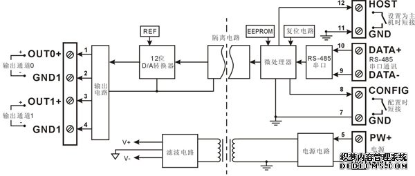 ISO DAO信号D/A(数字转模拟)转换器是基于单片机的智能监测和控制系统,所有的用户设定的校准值,地址,波特率,数据格式,校验和状态等配置信息都储存在非易失性存储器EEPROM中。