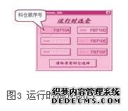 (未被掺混线或打包线使用,也不在冲洗模式)状态,则画面上的选择按钮为可操作状态,plc程序根据操作员的点击顺序重新生成顺序号,再根据顺序号对选择的料仓逐个加料。如果操作员不重新选仓的话,程序进入循环切仓模式,即切换到预先选择的第一个料仓进行加料。运行时选仓窗口界面如图3所示。