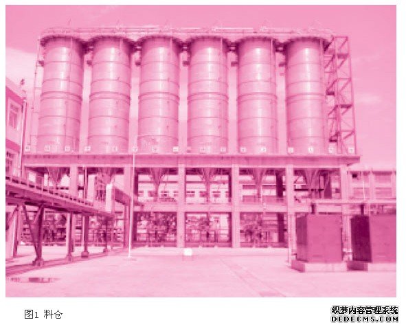 本系统采用稀相输送工艺,共有送料、掺混、打包三条输送线。送料线部分负责将挤出机挤出的粒料送到预先选定的目标料仓中;掺混线的功能是将粒料均化,以保证产品的品质;打包线将掺混后粒料送到打包料仓中储存。料仓共6个,兼储存、掺混用途,三条线共用,因此涉及的如蝶阀、旋转阀、过滤器等共用设备众多,联锁繁杂。料仓工程现场如图1所示。