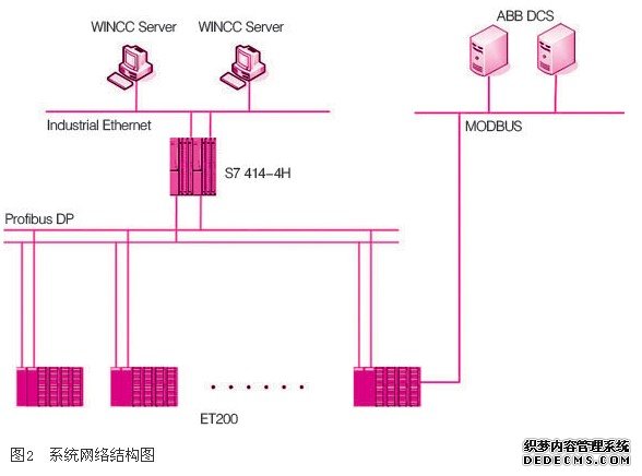 项目使用siemens公司s7-300/400系列plc构建控制系统。为了满足客户的cpu和上位机冗余安全性要求,并且所有数据要和dcs交换,考虑到现场io点数多、公用设备多、联锁复杂等因素,cpu采用s7414-4h,通过profibus-dp网络挂接et200站组成分布式结构,如图2所示。