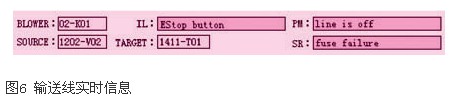 输送线停止方式有两种,分别为正常停车和快速停车,正常停车即程序按照停车流程逐步停止该线所有相关设备,此时pm栏会显示当前正在执行的停车流程;快速停车则省略了停车时的吹扫过程,适用于一些比较紧急的状况,停车时sr栏会显示本次停车原因,该信息一直保存到输送线下一次运行时才被清除。输送线实时信息如图6所示。