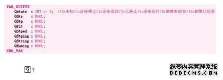 在使用scl编写fb/fc时,一律采用局部地址,控制逻辑在fb/fc内部完成,对外仅提供调用接口。例如:按照科倍隆要求,hmi上的设备图标在故障到来而操作员未应答时闪烁,应答而故障未离开则红色不闪烁,因此定义了如7图所示的输出接口。