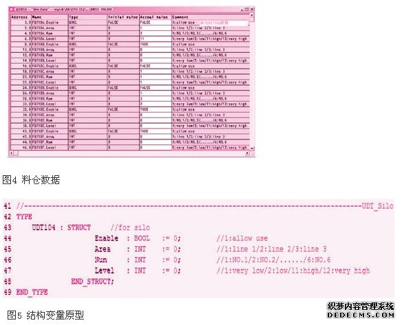 在编程时为料仓建立一个结构变量以储存料仓信息,包含顺序号、当前料位等数据,图4、图5分别是在db块中的料仓数据和结构原型。