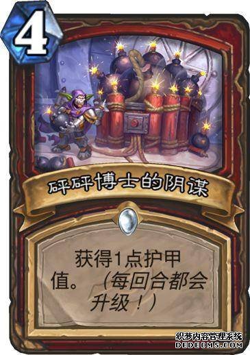 砰砰博士的阴谋:一张纯粹的护甲卡,而且要在手上多个回合才有一定作用,小编并不看好他的表现。