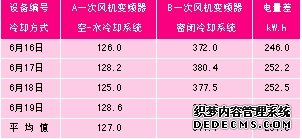 3#机组采用变频改造后,2台一次风变频器冷却系统的实际耗电量统计如附表所示。通过数据分析可以得出:在同一机组的同负载运行工况下,采用空-水冷却系统的变频器较密闭冷却方式的变频器平均每天少用电251kw.h,相比而言节约66%电量。