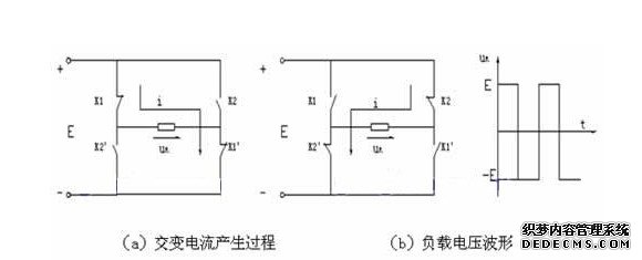 当两组开关K1、K1和K2、K2轮流切换时,负载R上便得到了交变电压uR。如果这两组开关利用四只电子开关器件来代替并轮流导通与关断就实现了由四只电子开关器件控制的直流交流逆变。