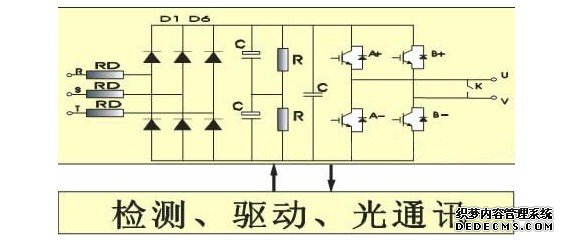 DFCVERTMV变频器的功率单元是以交直交的形式组成的,它是先把工频交流电通过整流器变成直流电,然后再把直流电变换成频率、电压均可控制的PWM波交流电。它由三部分组成既整流器、逆变器和中间环节如图3.1所示: