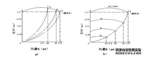 图2.2(a)为采用第一种方法时的特性 ,管路的节流阻力改变时,可以得到所需的送风特性。图2.2(b)为调速情况下风机的运行特性图中(pu)均采用标么值。