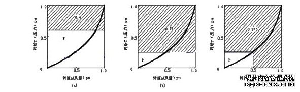 图2.4表示输入端风门控制、电磁转差或液力耦合调速控制以及变频调速控制方法下将风量调到0.5(Pu)时的节电情况。