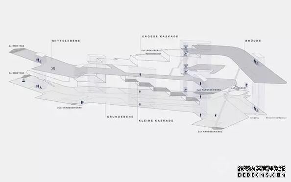 贯穿占地面积40000m2的中央大楼核心区域天花板上方的是一个空中走廊,其由一个有600台输送机的悬挂式输送系统组成,主要用于连接焊装、涂装和总装3个车间。该系统可将原始车身从车身车间输送到车身仓库,再送至喷涂车间,之后再将其送回车身仓库,最后从车身仓库送至总装车间。