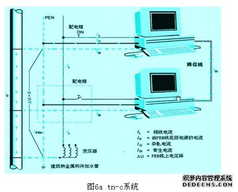 20-30年前,挂接在tnc配电系统上的电子设备很少,谐波问题不严重,emc的问题不太突出。三相负载平衡的情况下,n线上基本上无电流。然而,目前的低压配电系统的负载性质与以往有很大的不同。大功率的单相负载多了,带整流电源的电子设备多了,很多负载具有很高的3次谐波分量和高次谐波分量。因此三相负荷很难平衡,如前面已分析的那样:n线上除了不平衡负载电流外,还有叠加的3次(以及三倍频)谐波电流和其他高次谐波电流分量,n线上的电流很大,并在n线上产生电压降。图6.a为tn-c接地制式,其特征是pe线与n线合二为一成pen线。为了防止人身接触电击事故的发生,接在配电系统中的电气设备的外壳都是接地的。而电子设备除金属外壳接地外,电子设备之间用带屏蔽的通信线连接,其屏蔽层也是接地的,因而出现了多点接地的现象。