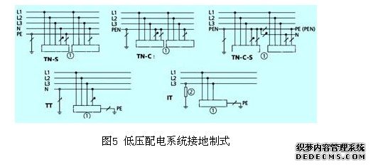 低压配电系统中的带电(流通电流的)导线是指电源相线(l1,l2,l3),n线(中性线);pe线(保护地线)仅在电气系统(或其中的设备)故障时,才流通故障电流,实质上也是带电导线。低压配电系统有三种接地制式,详见图5。配电系统不同的接地制式可用两个字母表示并加以区分: