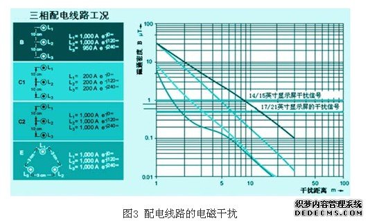 低压配电线路本身是一个大电场,电源设备的容量越大,电能越足,可向固定负载,移动负载和电动机等用电设备提供的电流也越大。低压电场(电压)通过电容耦合(分布电容)会在临近的其他线路中产生干扰的电压和电流;配电线路中电流在它的周围产生磁场,交变磁场可在环型线路中感应电势;配电线路中的电流也会产生电磁波,产生辐射干扰,以光速传播干扰距离较远的线路。配电线路在周围产生的磁场其磁通密度达1tesla时,可使14/15英寸的lcd屏幕图像闪烁;而0.5tesla的磁通密度足以使17/21英寸lcd屏幕(或crt监视器屏幕)的图像闪烁。德国曾把配电线路作为干扰源,lcd显示屏幕作为电磁干扰的受害者,研究两者之间的相互关系,即配电线路的工况与敷线方式对显示屏幕的干扰距离之间的关系。图3是通过试验得出的结果。其中纵坐标为线路在空间产生的磁通密度,横坐标为线路对屏幕的干扰距离。分析该试验例子可说明: