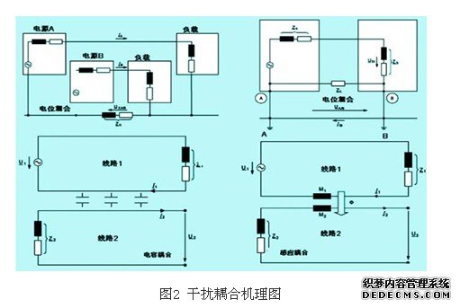 在寻找干扰源时,常用示波器观测干扰信号的波形。当发现信号线或控制线的直流电平上叠加谐波,50hz或150hz的交流干扰电平时,这些干扰信号多半来自于配电系统本身。如不从配电系统本身考虑,采用如图1中的推荐的(如接地,屏蔽,滤波等)措施很难消除这些干扰信号。在分析配电系统如何消除这类电磁干扰信号前,有必要先对电磁干扰的传播途径或耦合机理作简要的说明。