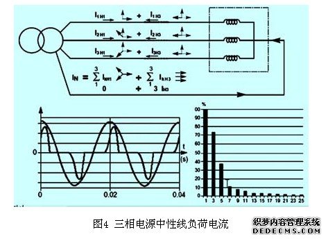 中性线配出的三相电源称三相四线制系统,满足了额定电压为220v大量的单相负荷的电能需求。对三相四线制系统来说,如三相负荷平衡又无谐波电流的活,则流过中性线的电流的向量和为零。目前,在公共建筑物,高层住宅和办公大楼中均配有大量的计算机,电子信息设备;电子娱乐设备,变频空调,调光器,以及电子节能灯等器件已深入到每家每户。这类设备通过整流器,从正弦电压波形的电网中吸取非正弦波形的电流,非正弦电流在线路上的电压降又造成正弦电压波形的失真。非正弦波电流含有大量的高次谐波分量,其中主要的是3次谐波分量。由于三相电源中接入大量的单相负载,事实上很难做到三相负荷电流平衡。三相负荷不平衡指的是接入三相电源的各相的功率不平衡,各相负载的功率因素不平衡以及各相负载产生的谐波电流不平衡。此时,中性线流过的电流为三相不平衡负荷(基波50hz)电流的向量和,三次谐波(三倍频次)电流的算术和,以及其他高次谐波电流的向量和,详见图4。正是由于上述原因,n线上会出现过电流(或过载)现象。因此设计低压配电系统时,很多场合不再减少n线截面,把n线的截面等同于相线截面。也正是由于n线上的不平衡电流和谐波电流,造成系统严重的电磁干扰(emi)现象。