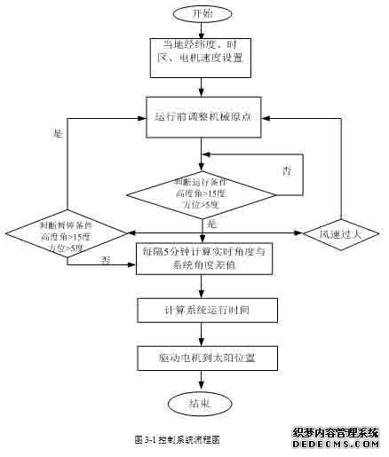 通过程序控制,可以自动判断是否满足运行条件从而达到自动启动运行装置、自动停止、返回初始状态等控制。增加风力传感器用于对系统的保护作用,当风力大于一定数值时,系统停止工作,复位到原点,风速满足工作条件时,系统自动开始工作。太阳能电池板有两个自由度,控制机构对高度角和方位角两个方向进行调整。当电池板转到尽头时,由于跟踪装置装了限位传感器,到限位触点时自动切断输出,电机停止工作。