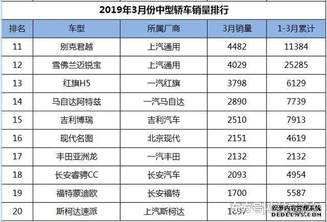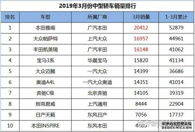 2019年3月中型轿车销量排行,雅阁、帕萨特、凯美瑞包揽前三_1