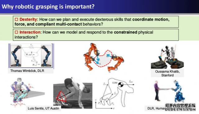 这个问题基本是一群大牛一开始就研究的问题,包括Salisbury,Mason,Cutkosky,Khatib 等等。大家研究来研究去,就是想知道:给定一个物体,给定一个任务,给定一个手,这个手该怎么去抓这个物体才是最好的?这个方向的最着名的结果算是force-closure了, 在很长时间基本相当于控制里面的稳定性的重要性了。我在读博士前两年,基本也是做这个,当时带我的博士后Sahar在这个方向做得相当不错,不过她转行搞金融去了。最近这个方向基本就是往与Learning结合的套路上走,可以参考Sergey Levine在Google时的工作。