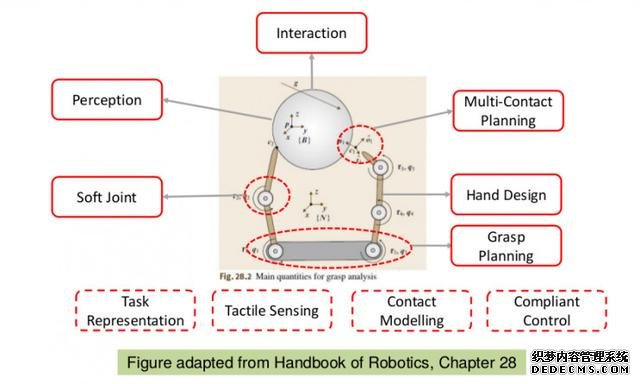 如下图所示,jrs英超直播吧_jrs直播_极速体育nba直播吧抓取的研究涉及到很多方面,包括机械,控制,计算机,人工智能等等。很多时候,jrs英超直播吧_jrs直播_极速体育nba直播吧抓取是一个很好的最小研究例子(minimal example),来支撑各个方向的研究。其次,jrs英超直播吧_jrs直播_极速体育nba直播吧抓取中的研究内容,特别是灵巧性和交互性,能够对其他很多相关的研究起到作用,下面的第二张图就说明了这一点。另外,抓取也是jrs英超直播吧_jrs直播_极速体育nba直播吧走进真实世界必不可少的功能,手对人类是如此重要,我们当然希望赋予jrs英超直播吧_jrs直播_极速体育nba直播吧同样的功能。