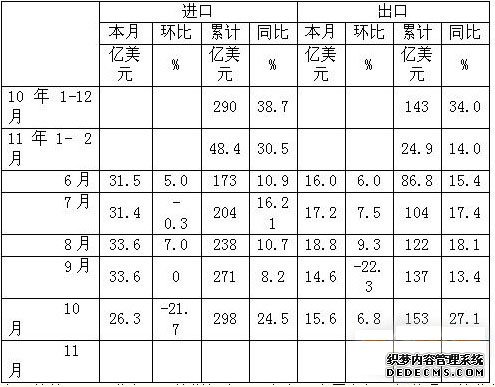 由于基数原因,进出口同比增幅在25%左右,尚属良好。但从月环比分析进出口分别从10月、9月开始明显下降,趋势是否延续尚待观察。从出口交货值看,已连续三个月超百亿,创新高,仍处上升态势。预计全年进口将达350亿美元,出口在180亿美元以上。逆差继续上升,将超过160亿美元。